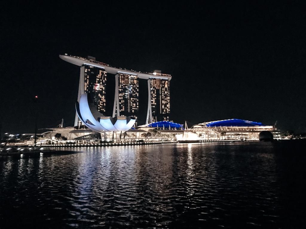 Arriviamo a Singapore alle 21:00 e dopo aver cenato prendiamo un taxi per raggiungere la Marina. La bellezza del Marina Bay Sands illuminato ci ha dato il miglior benvenuto che potessimo desiderare. Lì davanti si rimane a bocca aperta. È una costruzione incredibile, un casinò resort, costituito da tre torri alte 200 metri con sopra l’infinity pool più grande al mondo: 150 mt a sfioro sulla skyline di Singapore.