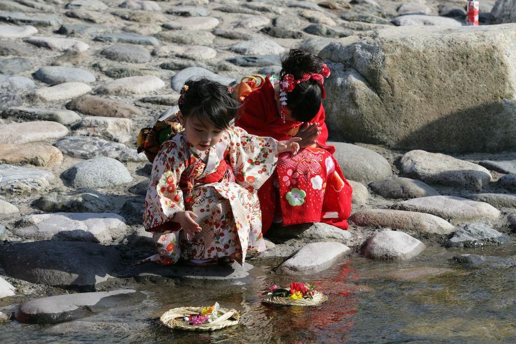 Bambine lasciano andare nel fiume una coppia di bambole -maschio e femmina – perché sia di buon auspicio.